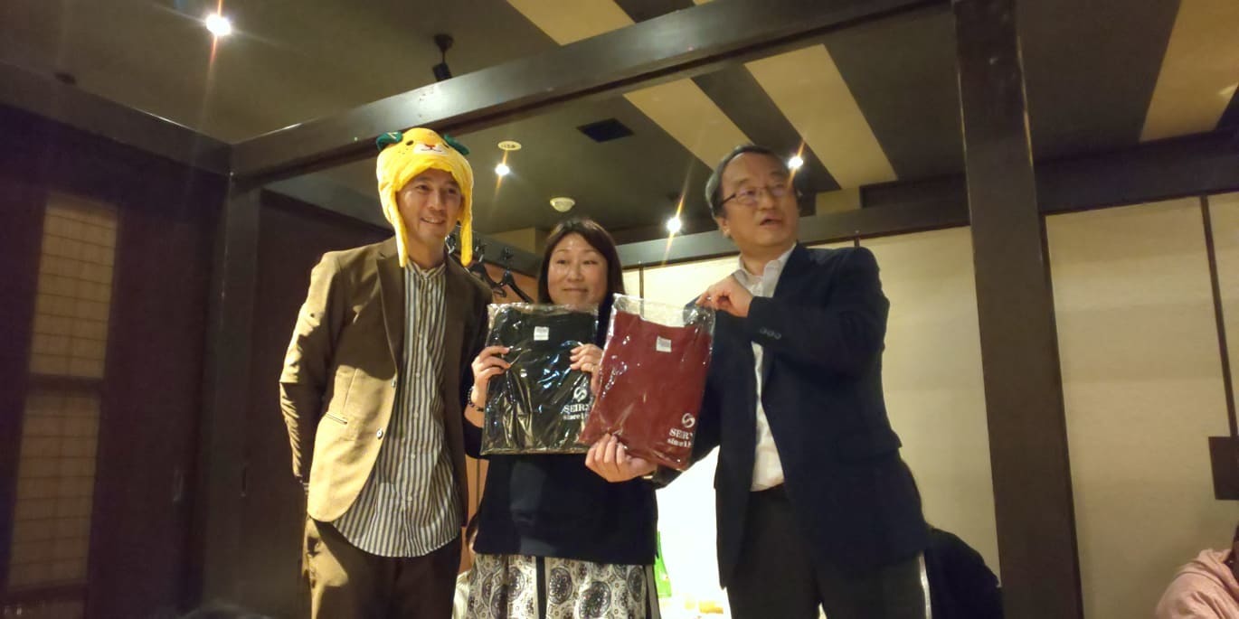 『日本酒の日記念酒』で乾杯した後は、しばしお酒と料理を楽しんで頂き、いつもは会の最後に行う『お楽しみ抽選会』を少し早めに行わせていただきました!プレゼンターはもちろん蔵元『首藤英友』さん!みきゃん帽子をかぶり、大抽選会が始まりました。特賞の『伊予賀儀屋Tシャツ』や『スマホシール』等、大盤振る舞いに、皆さん大盛り上がりです(笑)