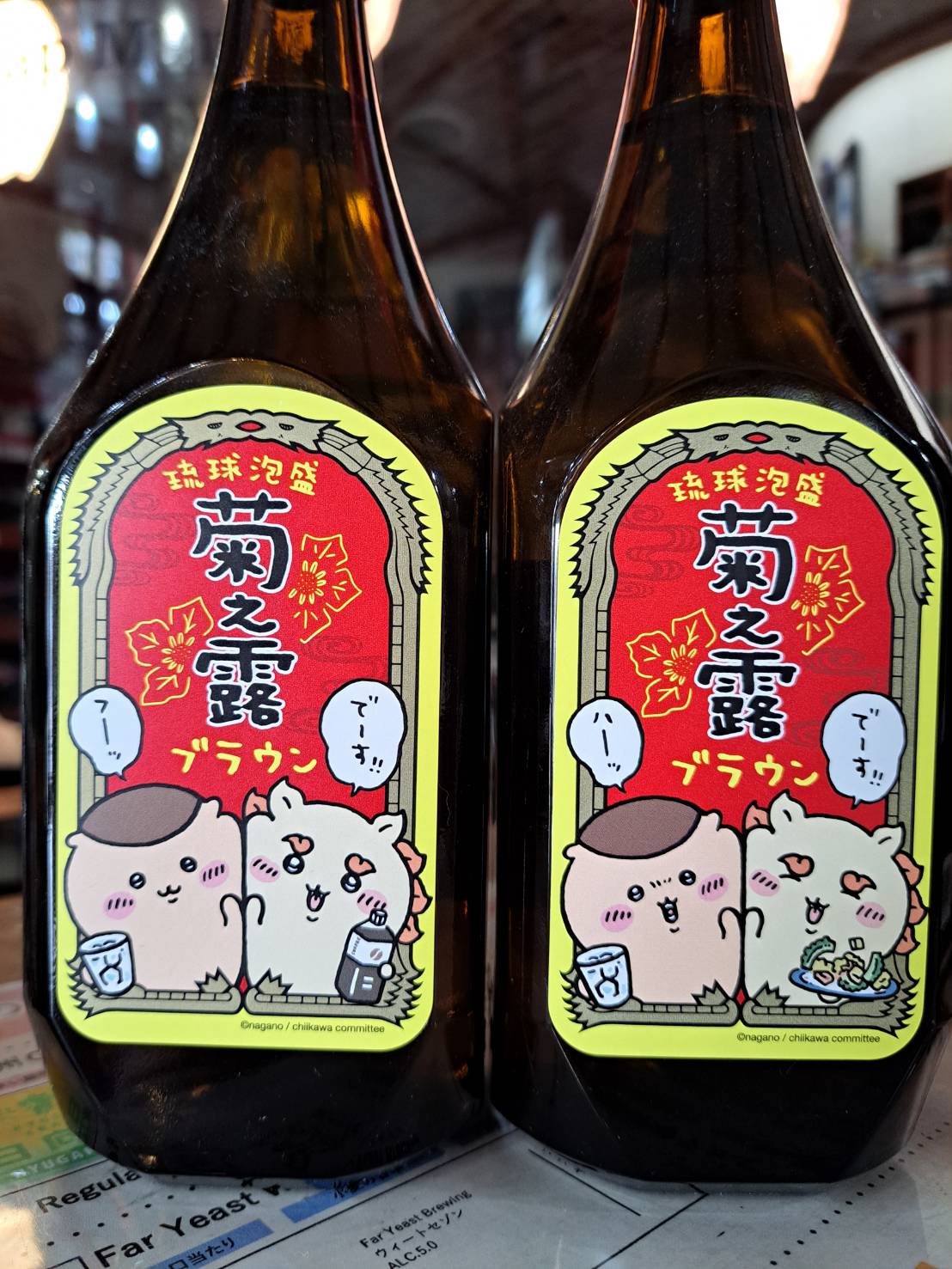 本日ご紹介する『菊之露ブラウン30度720ml』は、泡盛の発酵に適したミネラル豊富な宮古島の水で仕込まれた、菊之露酒造さんの定番酒です。食事を邪魔しないコクがありつつもスッキリとした味わい。食中酒として水割りで楽しむのがオススメです。更に今大人気の『ちいかわ』とコラボした限定品です。くりまんじゅう先輩とシーサー君と一緒に、コーヒー割りやゴーヤチャンプルーがデザインされています。