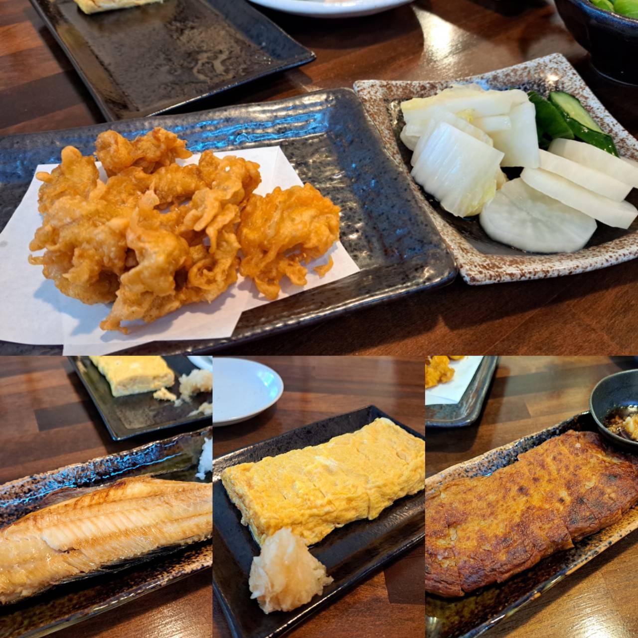 茨城の地酒と干物を中心に手作りの料理が並ぶメニューは、目移りしてしまうほど・・。早速、ホッケの塩焼き、出汁巻玉子、お漬物盛り合わせ、を注文しました。日本酒は、今が旬の武勇・純米吟醸ひやおろしと太平海・純米吟醸びん囲いを合わせることにしました。店内の壁には、お勧め日本酒の味わいの説明が書かれており、初めて飲む方にも優しい心配りが感じられます。もちろん、和らぎ水もいただけるので、気軽にお願いしてみるといいですね。