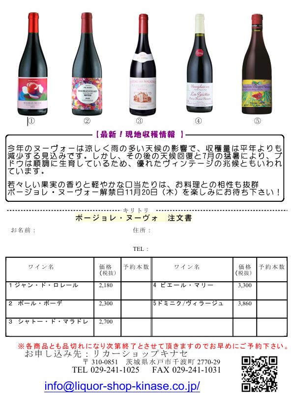 いずれの商品とも、残りわずかとなっていますので、気になった商品がありましたらお早めにご予約下さい。では、今年の『ボージョレ・ヌーヴォー』が入荷するまで、もうしばらくお待ちください。