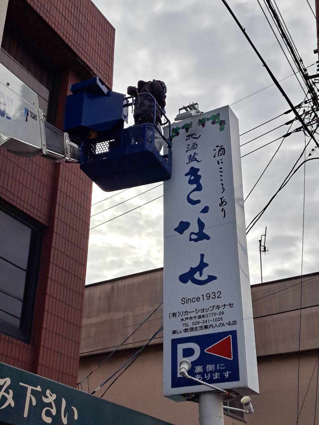 今回の連休では、東日本大震災以降、長年の懸案事項だった店頭ポール看板の照明工事を行いました。経年劣化からLED照明の明るさが悪くなってきて、日中の陽が長い夏場などは気になりませんでしたが、日没が早くなる冬場になると照明をつけていても看板の文字が見難くなっていました。