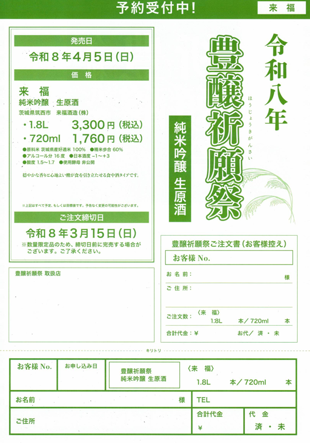 来福酒造さんから予約限定日本酒の案内が届きました。